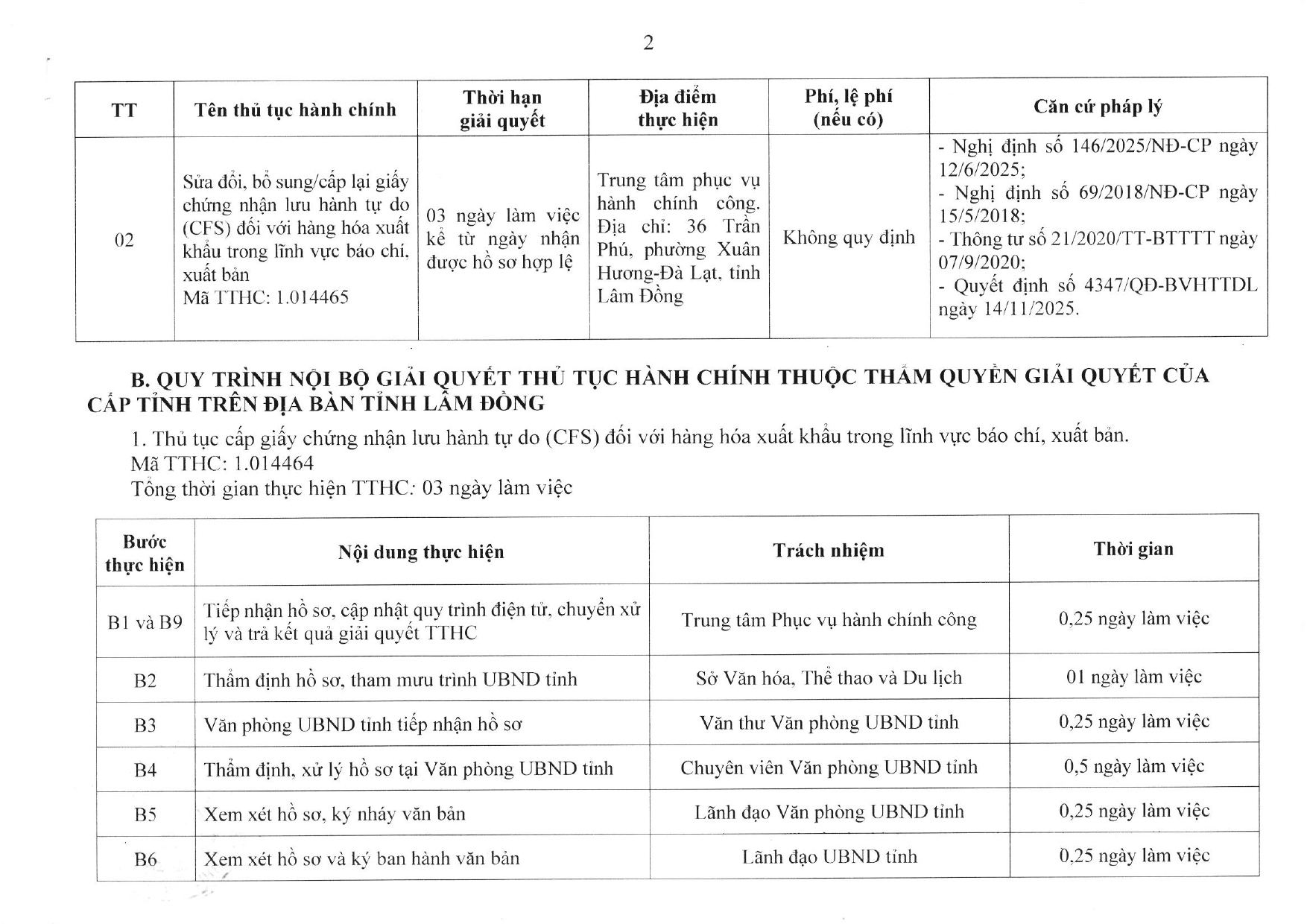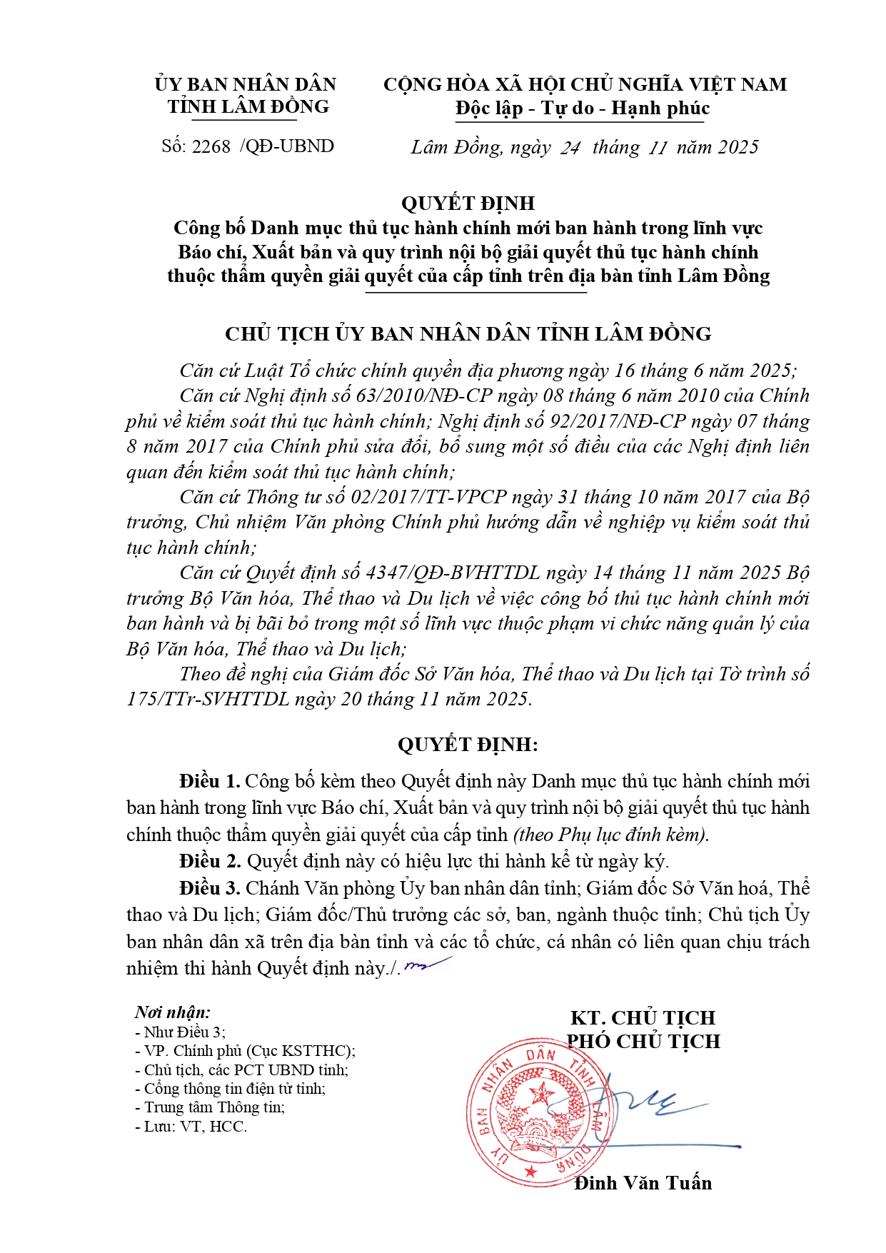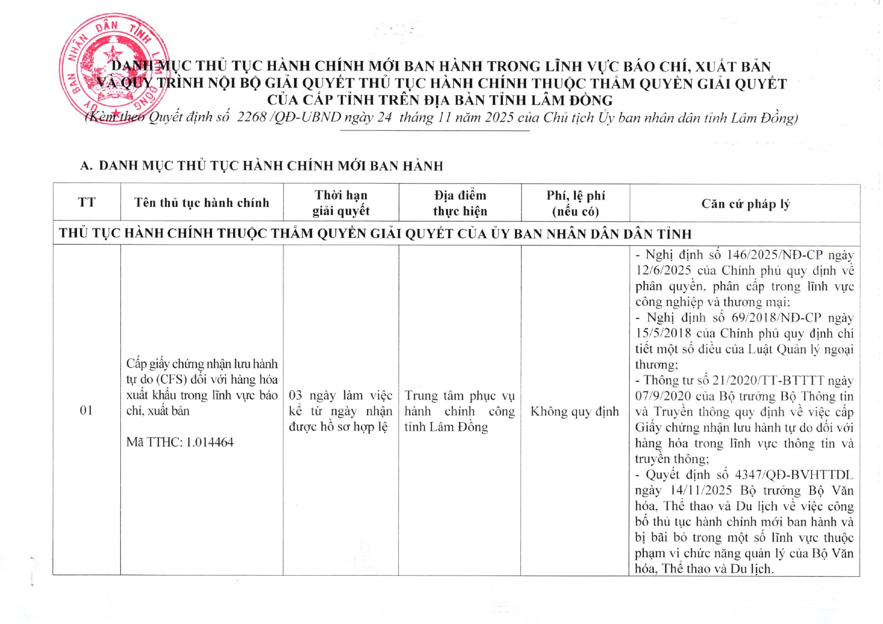 Công bố Danh mục thủ tục hành chính mới ban hành trong lĩnh vực Báo chí, Xuất bản và Quy trình nội bộ giải quyết thủ tục hành chính thuộc thẩm quyền giải quyết của cấp tỉnh trên địa bàn tỉnh Lâm Đồng