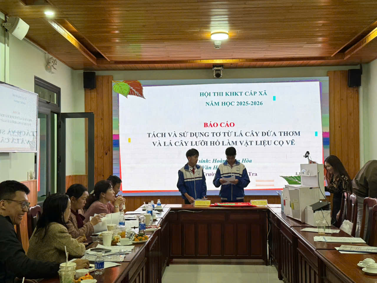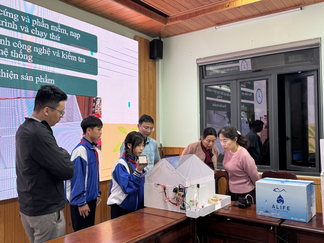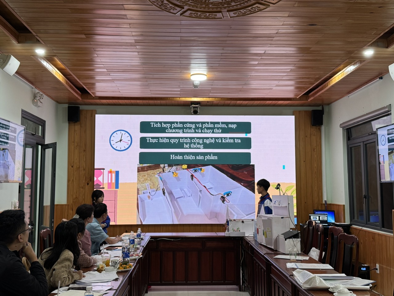 Tại hội trường, các nhóm học sinh đã trình bày báo cáo, mô tả quy trình thực hiện và trả lời câu hỏi phản biện từ Ban Giám khảo. Nhiều đề tài có tính ứng dụng cao, đặc biệt là các mô hình ứng dụng AI, Arduino và hệ thống điều khiển bằng giọng nói, cho thấy sự sáng tạo, chủ động nghiên cứu và khả năng tiếp cận công nghệ mới của học sinh xã nhà. Các đề tài về vật liệu tự nhiên và nghiên cứu tâm lý học sinh được đánh giá có hướng tiếp cận mới, phù hợp thực tiễn và mang ý nghĩa xã hội.