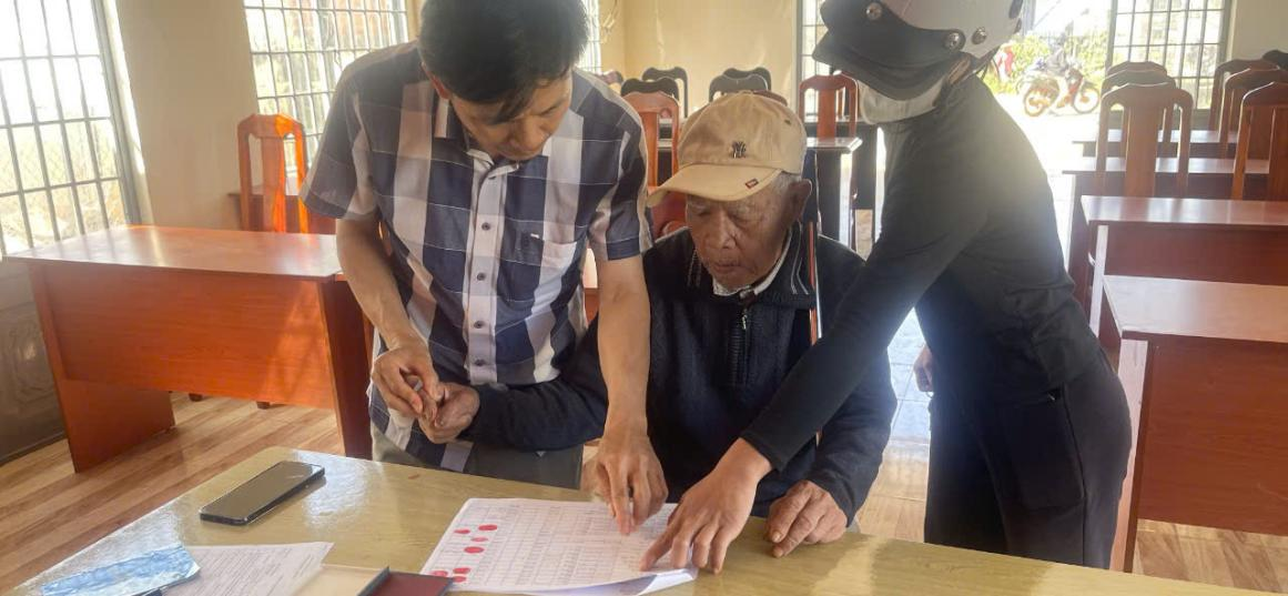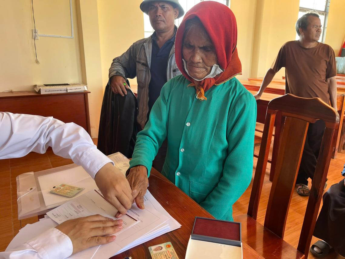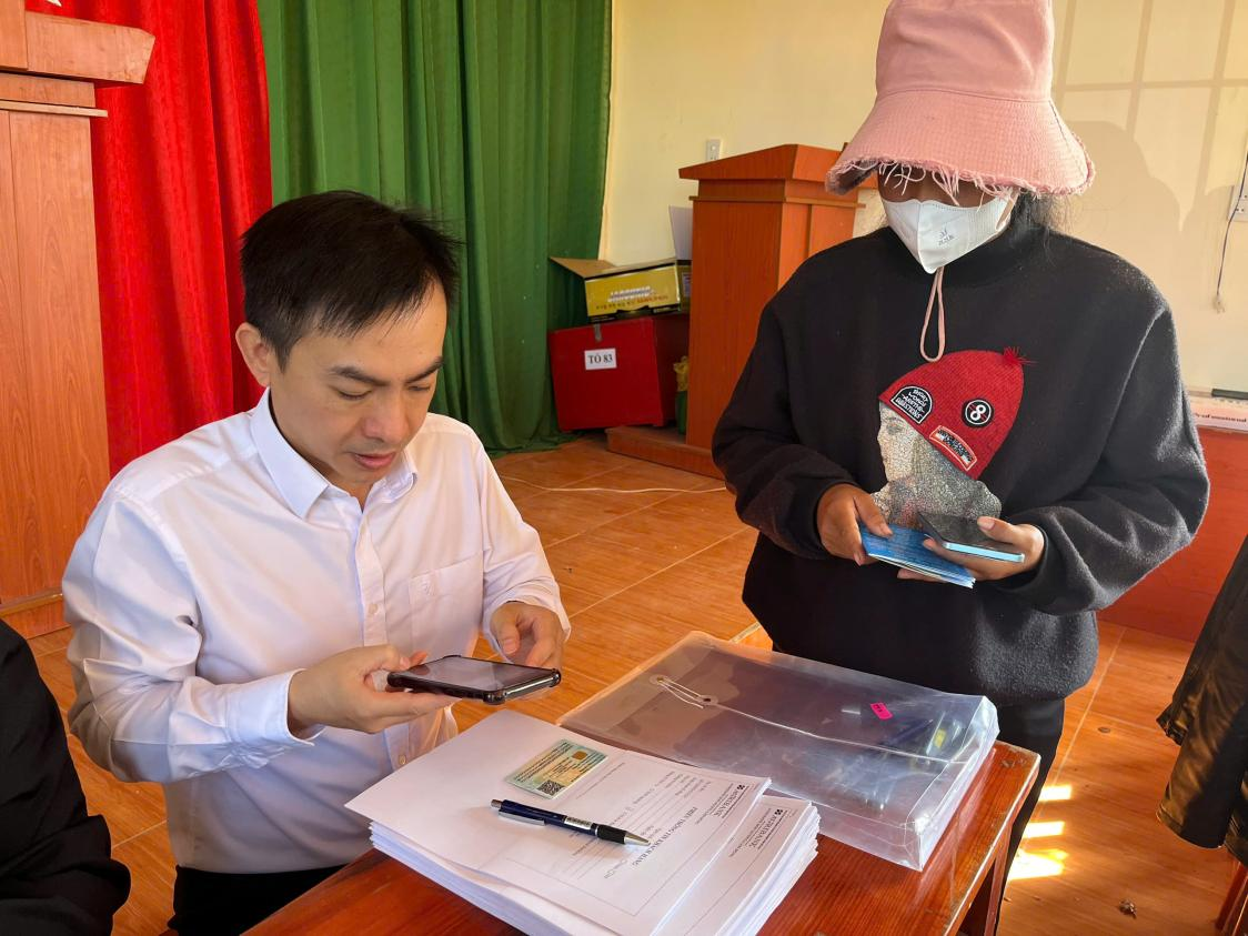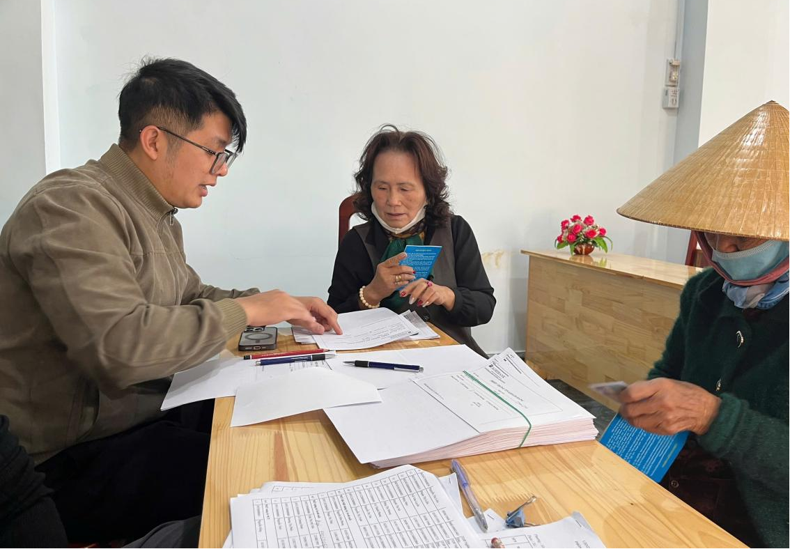 Cán bộ ngân hàng hướng dẫn và hỗ trợ đối tượng bảo trợ xã hội hoàn tất thủ tục cần thiết để kích hoạt tài khoản ngân hàng cá nhân