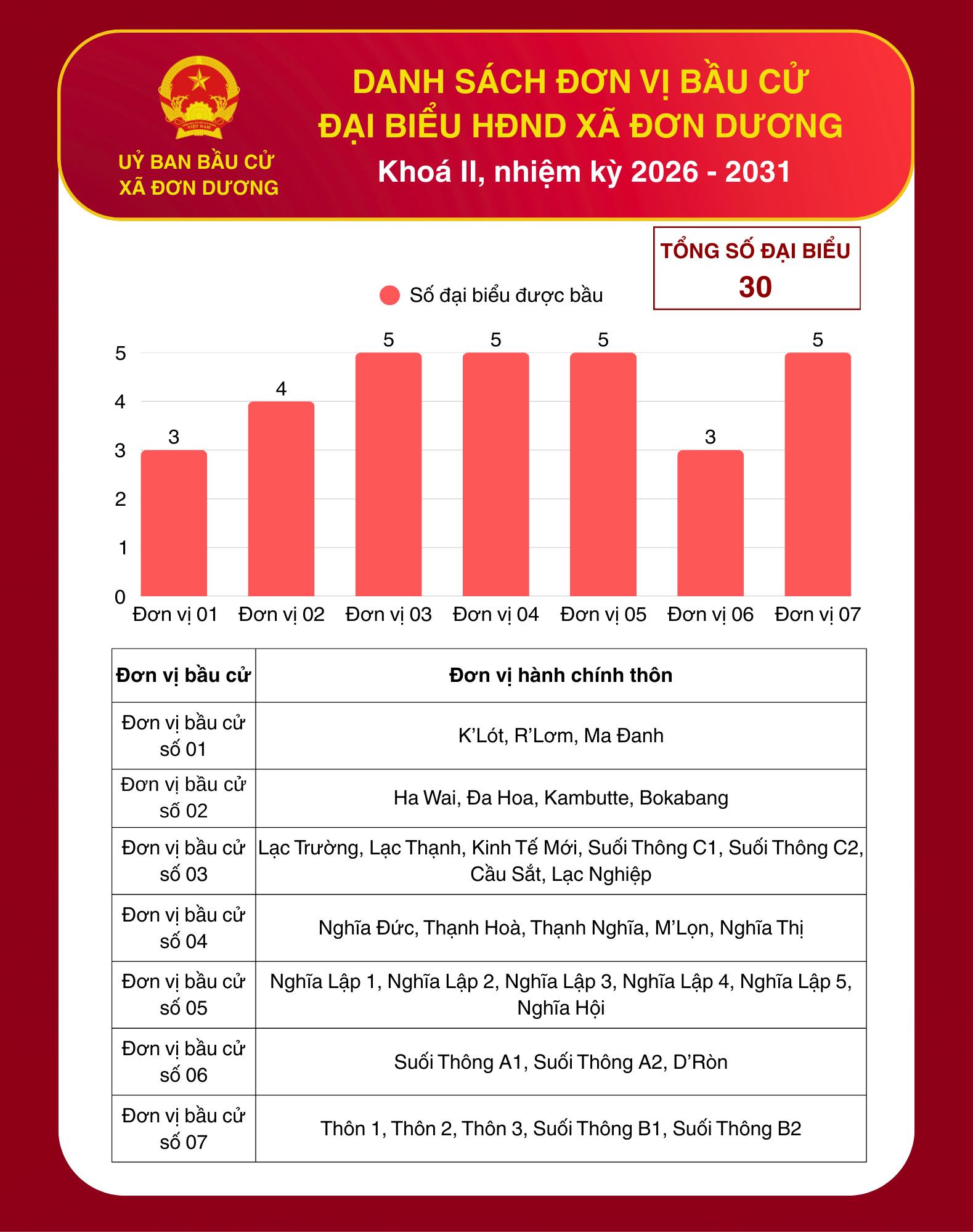 Tại hội nghị, Ủy ban bầu cử xã đã công bố Nghị quyết số 01/NQ-UBBC ngày 18/12/2025 về việc ấn định và công bố các đơn vị bầu cử đại biểu Hội đồng nhân dân xã. Theo đó, toàn xã Đơn Dương có 07 đơn vị bầu cử, với tổng số 30 đại biểu Hội đồng nhân dân xã được bầu tại các đơn vị bầu cử.